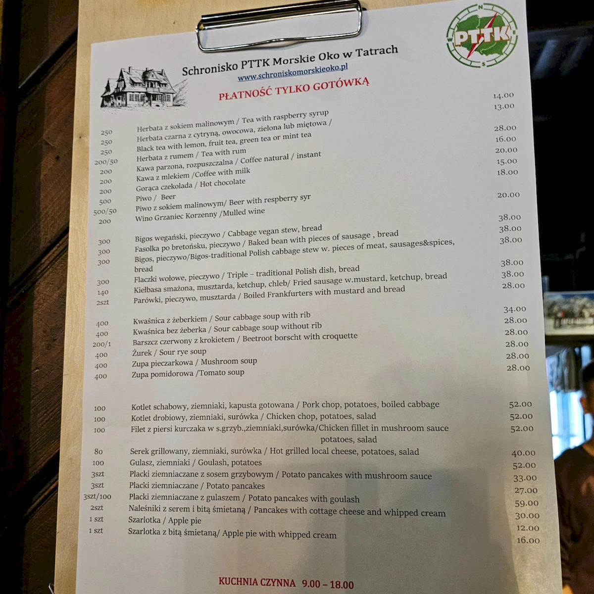 Tee mit Himbeersaft – 14 Zloty, Kaffee mit Milch – 20 Zloty. Weißer Bohneneintopf? 38 Zloty. Roter Borschtsch mit Kroketten – 28 Zloty, Sauerkrautsuppe mit Rippchen – 34 Zloty, und gegrillter Käse, Kartoffeln und Salat – 40 Zloty. Schweinekotelett oder Hühnerfilet mit Kartoffeln und Salat? 52 Zloty – das sind die Preise auf der Speisekarte der Schutzhütte am Meerauge, veröffentlicht auf dem Facebook-Profil „Aktualne Warunki w Tatrach“.